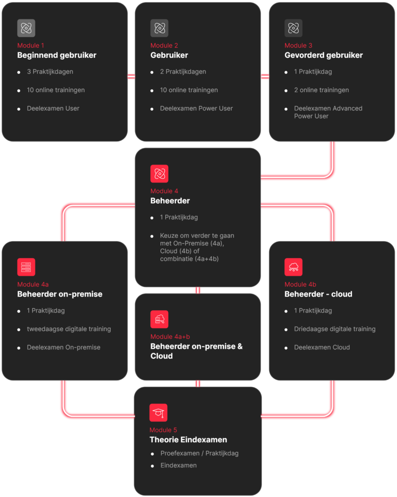 De lesinhoud van deze opleiding is verdeeld in vijf modules, waarvan de vierde module bestaat uit drie varianten. Deze varianten zijn verdeeld aan de hand van de beheerdersspecialisaties die voor jou het meest relevant zijn, namelijk On-Premise, Cloud, of een Combinatie van allebei.